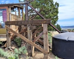 Again a spectacular morning, filled with enthusiasm about the day before and hope for the day’s events. On the agenda: progress on the water tower. Last trip, we had moved the corner posts in, so now we wanted to double check that and then set the rest of the posts. We checked and re-checked distances and level and got the 4 corners to a final position. We used all the rocks that Vinny and Ken collected last year and put in the wire bin to build up a base around the 3 posts on the East side, the slopiest and rockiest side, then we worked our way around to the South and then West sides. We easily dug out rocks we needed to and made nice flat and smooth settings for the posts to sit on; pretty soon we had 7 exterior posts in position and supported by a variety of bracing. We were lucky to find a post of the exact height for the center post and used more rock to help stabilize it.