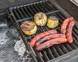 Of course, my lunch time lingered and beverages flowed, and the front of the cabin had the most trim, especially around the door, but I was buoyed by the thought of having it completely done. The timing was perfect and it looked pretty good. I was really happy with the filling capability of the paint, it sealing up many gaps and blemishes, and giving it a clean consistent color. I had time for a celebratory cocktail, a good cool shower at the kitchen tank, clean clothes, and on to dinner. Steve had told me how to prepare and BBQ eggplant so I was really looking forward to that, as well as some good hotdogs.