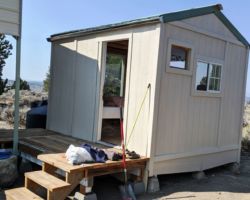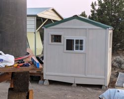 Much of the problem was continued worry, fear, and loathing about the trailer. I decided I couldn’t do it, but I dreaded calling Big Mike and telling him. I again was excited to get going on a long list of projects before I left. I was up early and visited the shitter. I took the opportunity, while there, to put some water in the hole to help stimulate some microbial activity. I continued on down the road to hide a gate key. I hooked up the downspout of the cabin gutter to the water tank, then I hooked up the gutter from the kitchen to that water tank. Although we had missed out on some rain, we were now ready to catch any subsequent precipitation coming our way. I taped and re-taped all the fittings for the kitchen tank to stop the small leaks from the valves. I counted and measured the spacing in between the studs in the cabin to help get an accurate assessment of the insulation I will need.