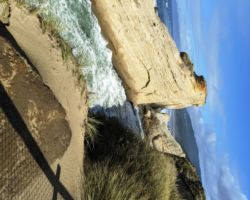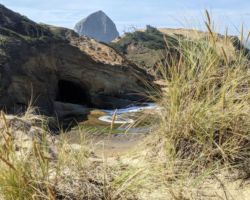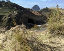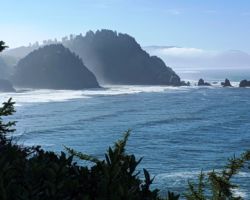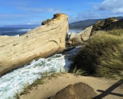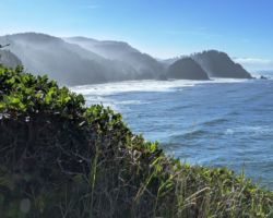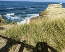 We headed to the beach and then up the massive sand dune up to a sandstone point, 1 of the 3 Capes as they call them, Kiwanda along with Lookout, and Meares. The vistas of the ocean, beach, ton, and forested mountains from up top were incredible. We lingered quite a while, waiting for the hawk to fly out of the tree, and even got to see a dory boat come in. It was a great stop.