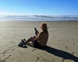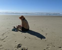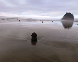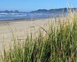 Looking at Googly now, I see this spit went for 5 miles to the mouth of Netarts Bay, just a sand strip about 500’ wide with a strip of coastal vegetation on the east side shaped like a lamb rib, super narrow at the campground end and fairly substantial by the time you get to the mouth of the bay. With the sand so fine and firm, it would have been great to get to the mouth, but that will have to wait for another day. We had a wonderful walk along the beach; a perfect re-introduction to the coast and a perfectly relaxing afternoon.