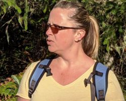 To make matters worse, they had just covered a third of the roof with blue plastic tarps to hold out the rain and the maintenance guys were there talking about repairs and damage and the work they had to do. It wasn’t exactly helping to place me into the winter of 1806 Corps of Discovery so I could be at one with the setting and history and spirit of the place. Fortunately there was a rangerette sitting alone under a canopy with a bunch of empty benches in front of her as if awaiting her next presentation. I went up to her and she greeted me warmly so I sat down and started to talk with her. She was great. We talked and talked and Kristen joined us and I was feeling better about the whole thing.