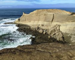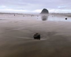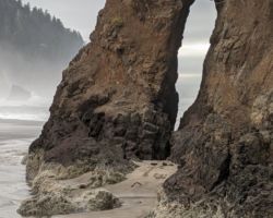 We gave it a good try, but with the day getting pretty long, we just stopped and parked, and walked down the trail and stairs to the sandy strip of Neskowin Beach. Proposal Rock sits on the beach, a very cool and rather different kind of lone island or stack because it is literally on the beach; it isn’t inaccessible out in the water surrounded by waves and surf. Neskowin Creek runs right to it, across the sandy beach but on the surface, nt absorbed into the sand. When it hits Proposal rock, it splits in half, some of the creek going around the North side of the rock and some very equal amount heading around the south apron.