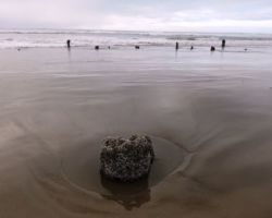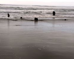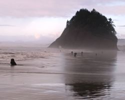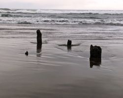 This was reward enough, but we still hadn’t found the “Ghost Forest”. We took our shoes off to cross over Neskowin creek in the middle of the beach and walked South where I recall the ancient tree stumps were. We eventually saw them in the growing dusk of the long day. There were hardly any stumps left, nothing like the picture I saw from some distant time, but it was still very cool, and I was super happy to have found it. We stayed on the beach quite some time, barefoot in the surf, taking lots of pictures, and enjoying another awesome day on the Oregon Coast. This was a special spot.