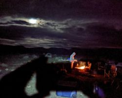 Before doing anything, I flung myself down a rock lined trail, much like those at Saline Valley in Death Valley, in hopes of finding a hot spring. Oh boy did I. The trail ended right at a very nice rocky bottom, dammed pool, with a sweet rock bench and stepping stones for easy access exit. I was thrilled. Hustling back to the boys with my report, they were fast at work wetting up tents and then getting camp ready. It was dark by now and headlamps and lanterns were called for duty. The boys speed and efficiency was impressive. We had a fire and kitchen up in no time and a celebratory beverage. Kenny was aiming high to fill Tommy’s shoes and had made a canteen of Manhattan’s. The boys consumed them in one sitting. Bob volunteered for whip up dinner and soon we had a smorgasbord of taco fixings. It was most excellent.