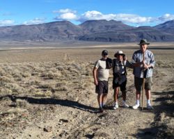 We turned around a mile or so down the road and came back to the tower, assuming we would easily find it not far from where we parked. However, we looked and looked, walked both sides of the steep banked elevated road, but somehow it disappeared. During our meandering back and forth and up and down, Bobby pulls up alongside and says “how do”. This blew our mind because Bob had texted us he was at the summit as we were at the highway 20 intersection, a good 20-30 minutes ahead of us. It turns out he stopped to visit the Pyramid Lake Museum in Nixon. He joined the search party, but somehow this plastic water bottle stumped us all and was not to be found. Eventually we gave up and headed on down the road to Gerlach.