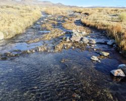 I got out of the spring and in just my sandals, I followed the trail Ken had explored earlier in the morning. The stream had a number of pools, perhaps 8, until it seemed to disappear. A distance beyond, it reemerged from the ground to bubble up in a thick muck that eventually cleared back up as it fell down the slope and through the grasses and roots and brush and became a clear stream again. Maybe a mile or so down, I came to the road we had come in on, maybe just a mile further down from where we turned off. The creek crossed the road and had at some time made quite a mess of it. Now tons of rock created the path that both vehicles could drive on and the creek could pass through.