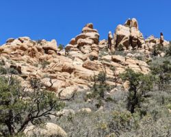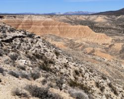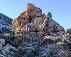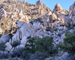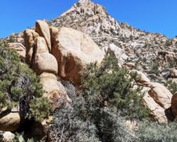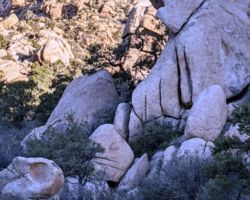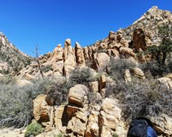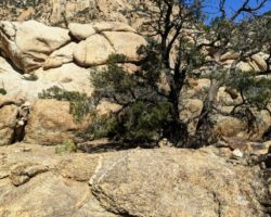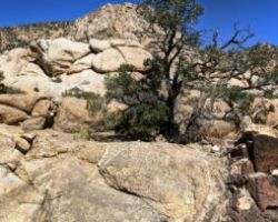 Bob pointed out the road he and Marya had camped on last Spring, and we eventually turned off on the last spur where Tom and Bill and I had driven with Jordan and David on our last trip to Mojave. When we got out of the rigs, we were met with the wind we had been expecting. This was the farthest up the canyon I had been, and although we were among a grove of large Pinyon Pine, the wind was blasting, and there was scant level or clear space. The boys were not home yet. We split up and explored a couple spur roads we had passed and Tom and I went back to the main road in and then turned left to go higher up into the canyon. There didn’t appear to be much road, but as is sometimes the case, we found that it did continue. There is always more to explore.