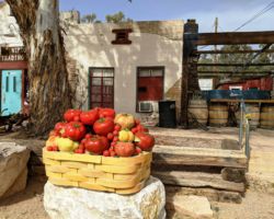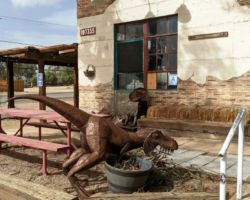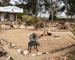 It soon became apparent that we were late for the boom history of Nipton. The store was closed; the bar was closed; the hotel was closed; the campground may have been open but we couldn’t tell. We pulled into a parking area that seemed to be attached to something, but we couldn’t tell what. A tiny “No Trespassing” sign at ground level alongside a chain that was laying on the ground didn’t provide much deterrent; not give a strong impression that they really wanted to keep people out. Besides, before us lay a very strange collection of “art” or desert strangeness not uncommon in these parts.