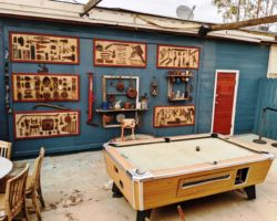 We snapped a few last pics and returned to the rigs, back across the chain and back through town. As we passed the bar/store, we also passed him talking to another old desert rat. He motioned us into the parking area in front of those buildings. This area had a nice large mesquite tree, picnic bench, some more art, and a sign talking about the brief history of Nipton. We looked around a bit to see if there might not be an open side door or secret entrance to these establishments. Still outside, I walked around to talk to these guys and see if I could scrounge up an unlocked door or access to anything in town. Maybe the secret poker game was in the abandoned trailer on the outskirts of town.