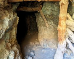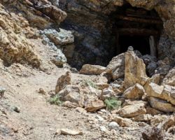 The road eventually became more of a narrow wagon trail. It clearly had been made for the mine, and perhaps even went up and over the ridge to the North, past the mine as more of a through road rather than just access to the mine. I was getting to the end of my hiking interest when Bob identified the little side trail up to the actual mine. Below the lip of the mine was covered in green shale-like rock and some of the wooden beams of the shoot and the massive bolts holding them together were still present. We poked around a bit and then retired in the shade for a celebratory beverage.