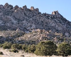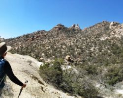 The next morning Tom was up and out early leaving the 3 of us to adjust. We had decided to wander back down the road and explore some of the side roads that headed up into rock formations and heavier vegetation. After a leisurely morning, we hiked out of camp to see what we could see. There were 2 tracks that passed between posts, without a gate, but were posted no trespassing private property. I know it is possible that some of that land is private, as we passed many private homes and ranches throughout the park. However, I was suspicious of these , thinking some rude people may have just wanted less people using the camp spots they liked.