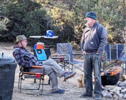 We got some grub and a beverage and sat in the shade reliving our hike. We dozed, and futzed with gear, and washed up, and nodded off, and read a bit. Eventually, it was grub time and Bob fixed up one of his tostada meals with all the fixins. It was wonderful. We had a nice little fire after the breeze died down even more. A gummy or 2 was distributed to ease the aches and pains and they must have invigorated the boys as we headed out of camp for a stroll up to the massive rocks that sort of marked the spot where the broad open savanna-like valley ended and the road dropped down into the thick Pinyon Pine forest we were camped in.