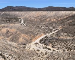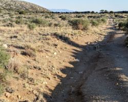 We were looking intently for signs of strong winds that were predicted for tonight, but with so little vegetation, nothing but short brush, it was tough to tell what was happening out there. My estimated distances were pretty darned close and we knew we were only about 6 miles from Caruthers Canyon once we turned onto NY Mtn. Rd. The roads were very decent and time passed quickly; the entrance to Caruthers did not look familiar to me, but coming in from the East at the end of a huge day may have contributed. Once up inside the canyon, we saw the old windmill and the steel water catchment basin and all the old heavy pipe. We had arrived.