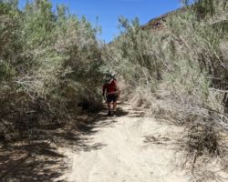 We made pretty good time going downhill at a gentle slope, broken up by vertical drops where any precipitation would create awesome waterfalls. We did discuss the likelihood of being able to scramble back up the drops, but we chose to do them all. The twists and turns afforded ample shade in stretches as we moved in and out of alignment with the sun. The narrows were highly entertaining and we moved along pretty well. We had gone pretty far and time was definitely on our minds, when we came to a dense thicket of willow and poplar and mesquite. Progress slowed to a crawl as we navigated this swamp, literally sinking into the damp muck if we were not careful with our foot location.