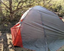 We soon had a good kitchen spot, but it took some time to find tent spots for each of us. We were all trying to figure out the wind, to no avail, so eventually settled for maximum protection on all sides. Tom and Bill positioned their rigs to add some level of protection, but we were getting the sense that this wind prediction was going to be more accurate that most weather forecasts. Everybody helped each other set up tents and roll out ground cloths. It was still sunny and warm despite the wind, so there didn’t seem to be a looming storm. It was probably near 7:00 when we finally had every single possible guy wire, tent stake, and rain fly support in place to hopefully withstand the gusts. I had used every piece of string, twine, and cord I had with me to lash the fly to the branches of the surrounding Pinyon. I was up a little trail into the dense trees, so I felt pretty good about my fate.
