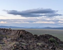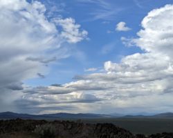 By the time we got to the main gate, we were almost constantly swatting away flying insects. The bug situation is far worse down below than it is up top. I assume that has something to do with how much rockier, drier, and less vegetation there is up top. The soil down below I would say is downright good, easy digging and very little rock, not even much small stones or pebbles as Bob and I found out when we set those railroad tie posts for the gate down by the cemetery. It is easy to see how much more sage, other brush, and flowers there is at the bottom versus the top. We had to stop for a rest by the upper gate and took in the incredible sky. The sky up here is one of the best shows on earth.