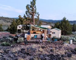 With yet another task accomplished, Mike headed on down the road, feeling much better than this drive last time. It was a great trip for him, even though it was only 2 nights. He suggested that this might be the last trip for him until it cools off in the Fall, but we will see. I headed back to camp and rounded up the remaining tools by the pit and elsewhere. I loaded the truck and futzed with the loose drain pipe under the sink at the shitter. I went down my list of jobs and was able to knock them all off except for the stairs coming off the deck between the front of the trailer and my cabin. Why not; it was still early and the work area was perfectly situated in the shade.