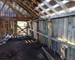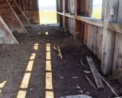 We poked around and discovered a few loose boards; 2 – 20’ 2 x 16, and the top of a feed trough that had been warm smooth and round from the cows. Along with a few more pieces of hardware, we were like kids in a toy store, all giddy with our bounty of booty. We were super dusty from the fine ground cow and swallow poop we had been working in and the dirt and dust we dumped on ourselves when we gathered the boards that had probably been in place for over a century. We were sore, tired, hungry, thirsty, and filthy, and the rigs were riddled with poop, but we were happy as hell.
