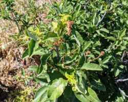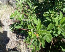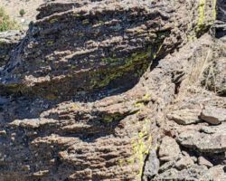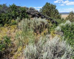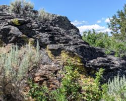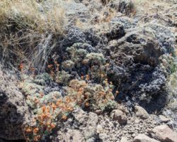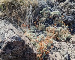 A little higher up was a huge flat, and a tremendous rock pile. These were still the same black volcanic rock that was up top, but they were huge uplifted plates, collars, and walls like above. These seemed more like bubbling blisters that made it to the surface and then cooled and dried. They were individual boulders like you see in the Sierra’s, Alabama Hills, Joshua Tree, of the canyons of San Diego, but they were individual mounds nonetheless. Between the masses was a bush or small tree that II had not seen before. It looked like a fruit tree and even had the leaf curl that is common with fruits. I was fascinated by how much of this shrub there was and intrigued at the thought of having some sort of feed/animal feed on the property.