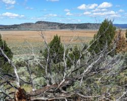 Down at the curve, I stopped again to look back at the cabin. Nothing visible by eyeball, but now the binocs picked out the entire cabin. I assume the glare off the giant glass window will make it visible at certain times of the day, but I was satisfied at how we positioned and oriented the cabin to minimize exposure. I headed back down West Side Rd. to cross back over the pavement and get back on the property. There is a small strand of land between Termo-Grasshopper Rd. and our property line, which contains perhaps the wettest spot near us. It was bone dry now, but had real nice tall grass growing thick on it. I walked through it and started gaining elevation side slope again towards the Eastern boundary.