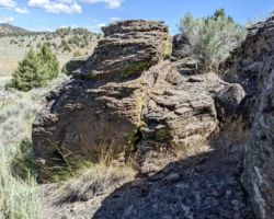 From the midpoint marker, I dropped down the slope to the top of the diagonal fencing we had Dale run up the Hill for us. We didn’t want to put up/pay for new fencing all the way along the road, but we needed to enclose/tie off the gate, so we just had him run the fence diagonally up the hill into the rocks. It would be pretty far for a stupid cow to go and hard for them to cross over the rocks, and it would be impossible for a rig to get around, so we figured it was a good alternative to another quarter mile of fence up to the northern boundary. From the fence I side hilled north, covering lots of new ground for me. Once near the NW corner, I knew there was another rock formation I wanted to check out, so I headed up to see it. It was a great resting/hiding spot and I imagined ambushing passersby from this advantageous position.
