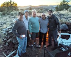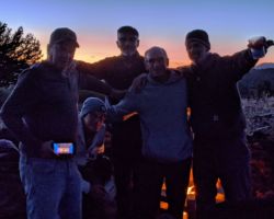Vince had asked me about sleeping in the trailer because his back was still sore from his Fall over a year ago. I could only offer him the couch as Steve was in the bedroom. He happily accepted and moved his gear into the trailer with Steve. Ken set his tent up under the tree Mike L. first settled I believe. Kevin moved his stuff from Bob’s cabin and set up under his Juniper tree along the road. It was nearly cocktail hour and the boys gathered in the kitchen, not specifically to watch the shower show, but to observe it nonetheless. I still have not gotten over what a huge treat it is to have hot running water in the kitchen and to eb able to enjoy a hot shower at the end of a good day.
