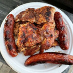 Since I kind of was prepared to work full days and not knock off early to clean up, get a shower, cook and eat before it was dark at about 6:30 these days, I wanted to cook all my food tonight so it would be ready to simply heat up or even eat cold. I was happy to have so much time to enjoy the fire and a cocktail and ease into my first evening on such a great day. I BBQ’d chicken and sausages, baked the stuffed mushrooms, and easily erased a half round of shrimps I warmed on the fire. It was a delicious dinner and I saved all the meat for other meals.